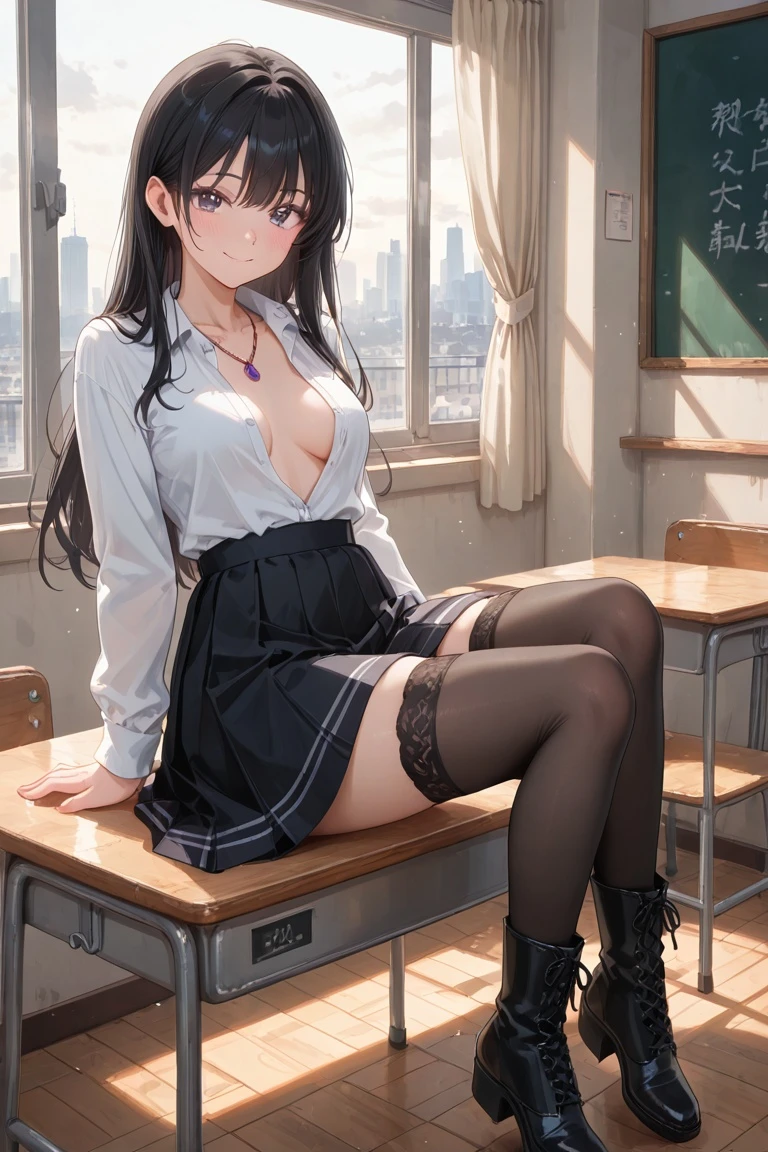 教室の机に腰かけているのは、長い茶色の髪をした若い女性の先生だった。黒と白を基調にした服装は落ち着いていながらもどこか優しく、特別授業に集まった生徒たちの緊張を自然とほぐしてくれる。 彼女は膝を軽く抱え、リラックスした姿勢のままこちらを見つめていた。 少し赤らんだ頬に、穏やかな微笑み。