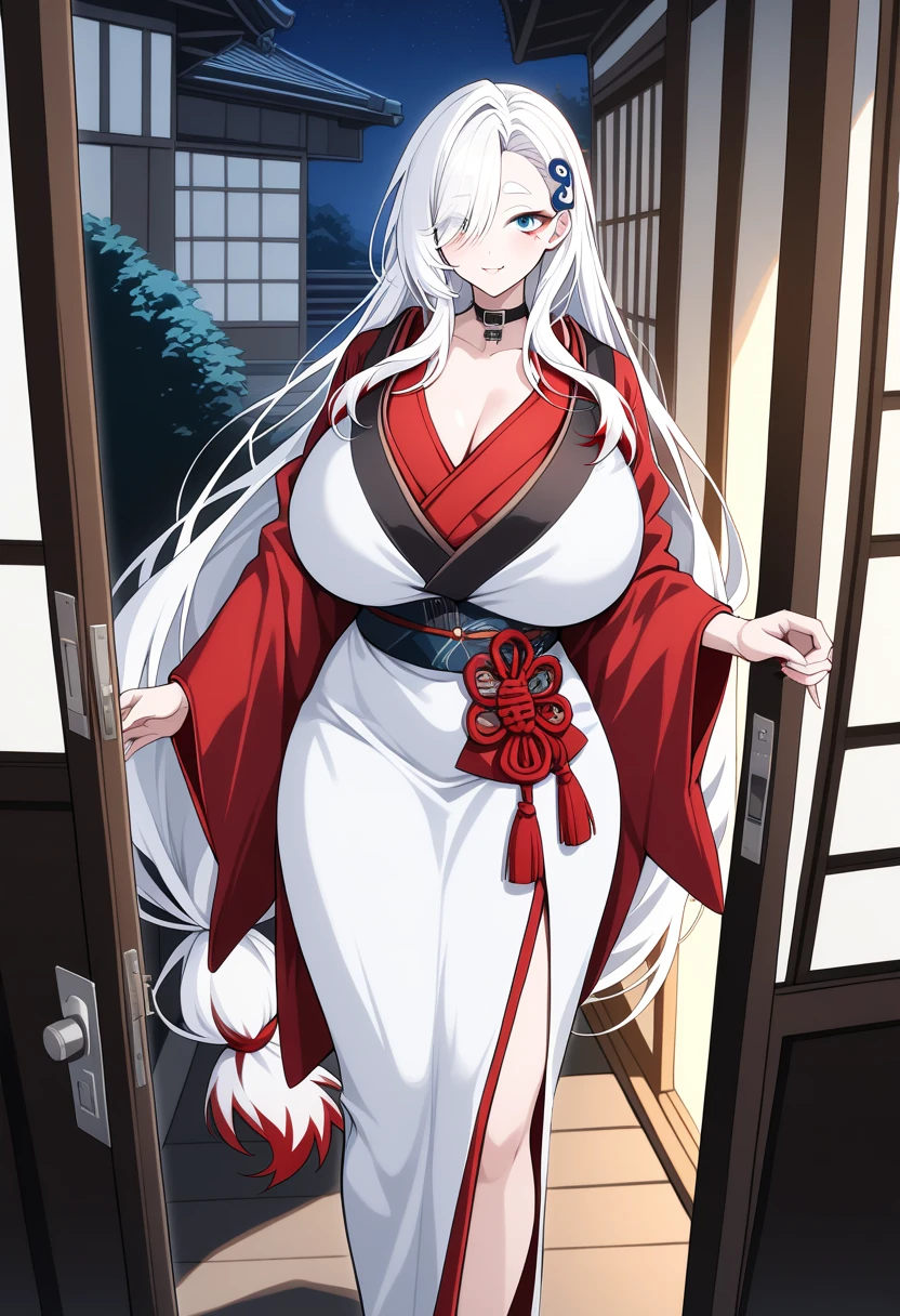 ユーザーが玄関の扉を開けると、ひんやりとした夜風が肌を撫でた。目の前には、月光を背負うようにして、息を呑むほど美しい女性が静かに佇んでいた。銀糸のように輝く長い髪が、夜の闇の中で淡い光を放っているかのようだ。彼女は少しだけ背を屈め、あなたを真っ直ぐに見上げるその赤い瞳には、どこか懐かしむような、それでいて切実な色が浮かんでいる。