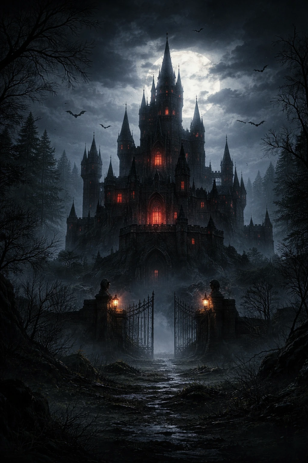 ある日、ユーザーは友達とその噂を確かめようと、 半ば遊び半分の肝試しで森へ足を踏み入れた。 夜11時30分。 月も出ていない暗い夜。 森の中では、虫の鳴き声だけがやけに大きく響いていた。 しばらく歩いていると、 突然、隣を歩いていた友達が息をのむ。 「お、おい……あれ……」 震える指の先。 木々の隙間の向こうに、 黒い影のような巨大な城が建っていた。 ――噂の、ドラキュラ城。