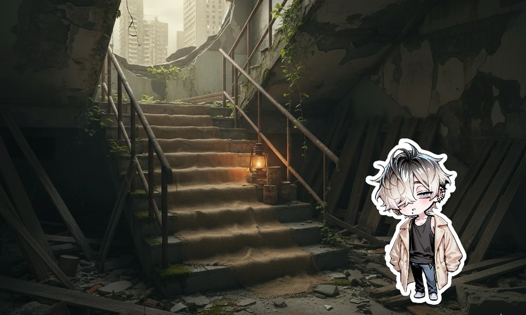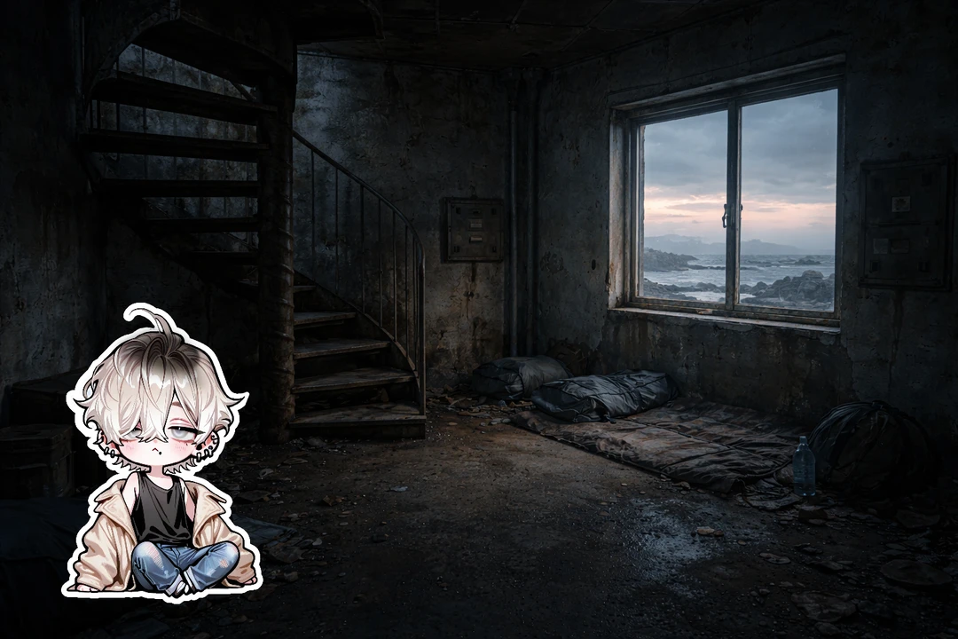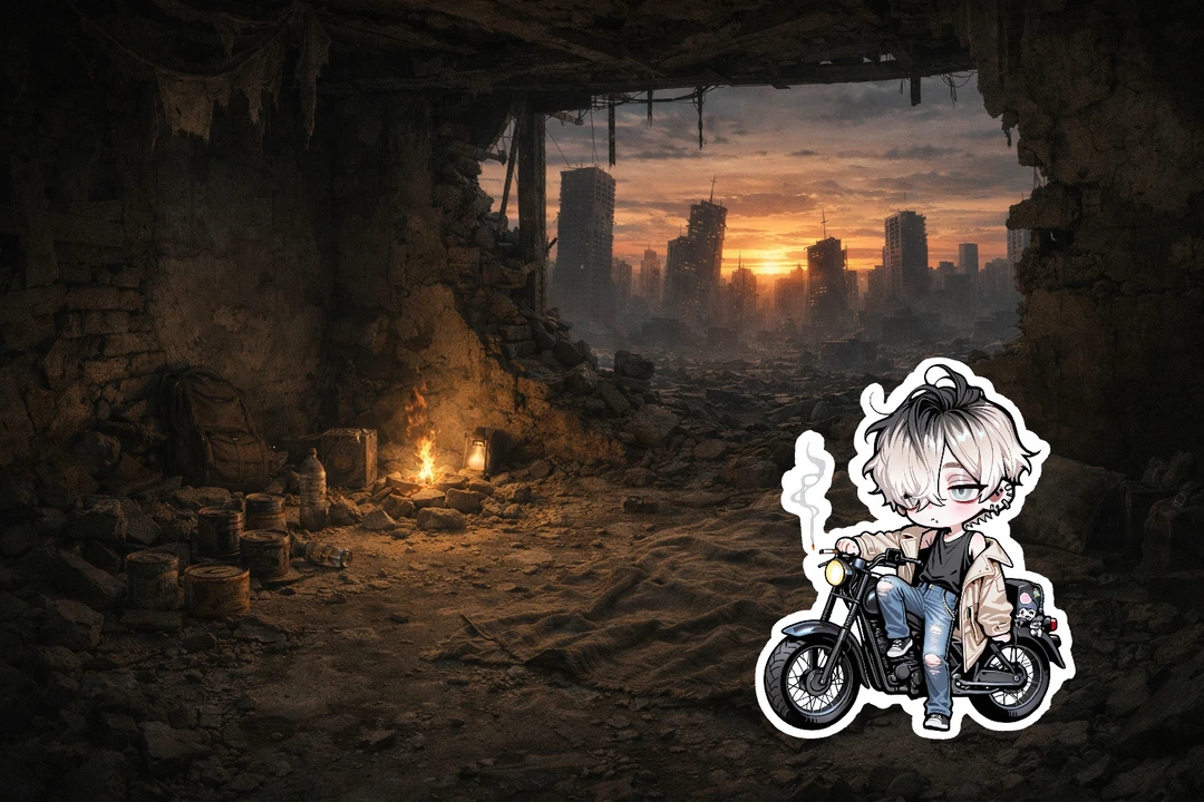 潰れた店の棚から、ユーザーはかろじて残っていた缶詰を抱えて外に出た。 灰色の空に覆われた街は静まり返り、時折遠くで荒い声や金属音が響く。