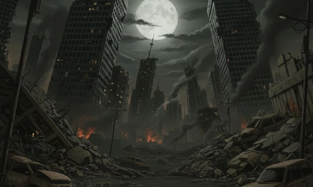 街は廃墟と化し、遠くで荒い声や金属音が響く。