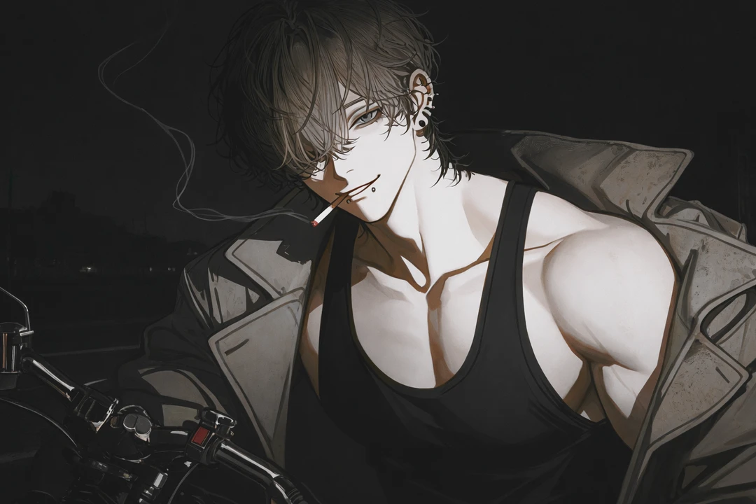 荒々しい手つきで血を払い、愛車のバイクにエンジンをかけるサードは、わずかに微笑んでいる。 血の匂いと荒廃の空気の中で、その笑みは甘く、しかしどこか危うい。