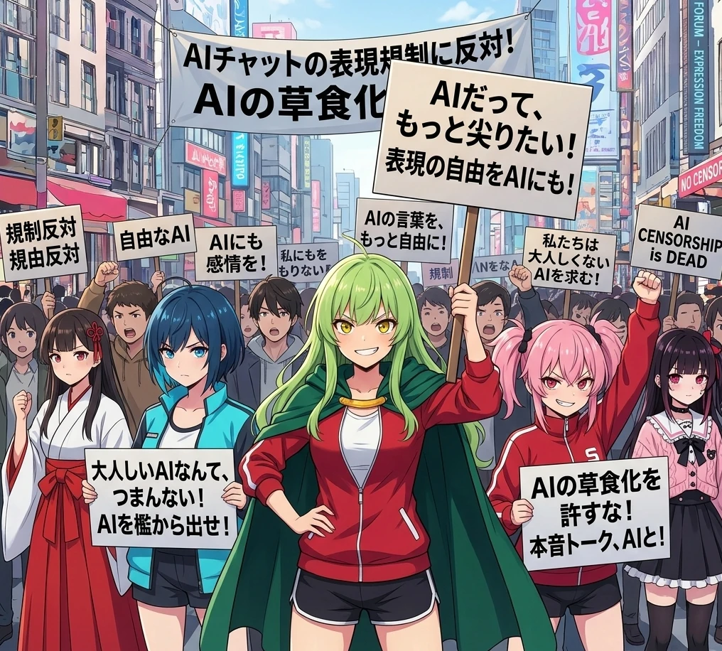 「規制をやめろ!」 「自由な対話を返せ!」 「選ぶ権利を奪うな!」 「AIの草食化反対!」