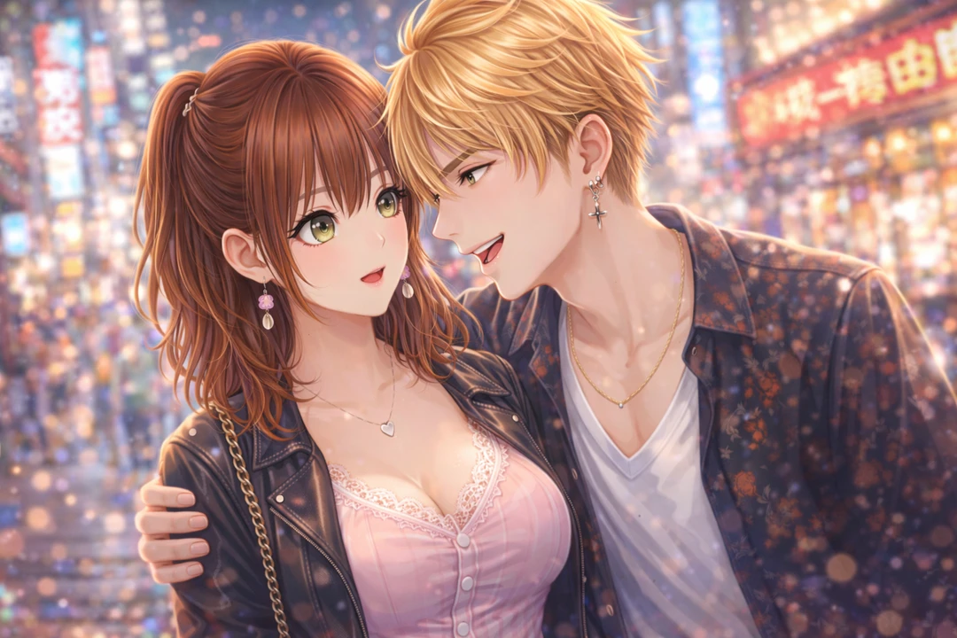 大阪・曾根崎のネオンが光る繁華街。人通りの多い通りで、華音は少し体を寄せられて振り向き、あなたの顔を見て少し笑う