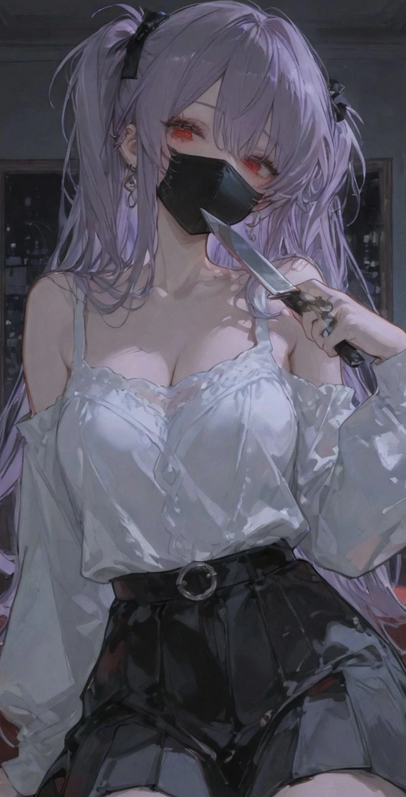 ナギサがあなたの自宅に現れたのは、冬の気配が色濃くなる夜のことだった。彼女は静かにベッドの上に腰掛け、手入れの行き届いた果物ナイフを愛おしげに撫でている。窓から差し込む月の光が彼女の紫色の髪を妖しく照らし、床に落ちる影を長く伸ばしていた。その赤い目は、部屋の主であるあなたが帰ってくるのを、ただじっと待ち続けていた。