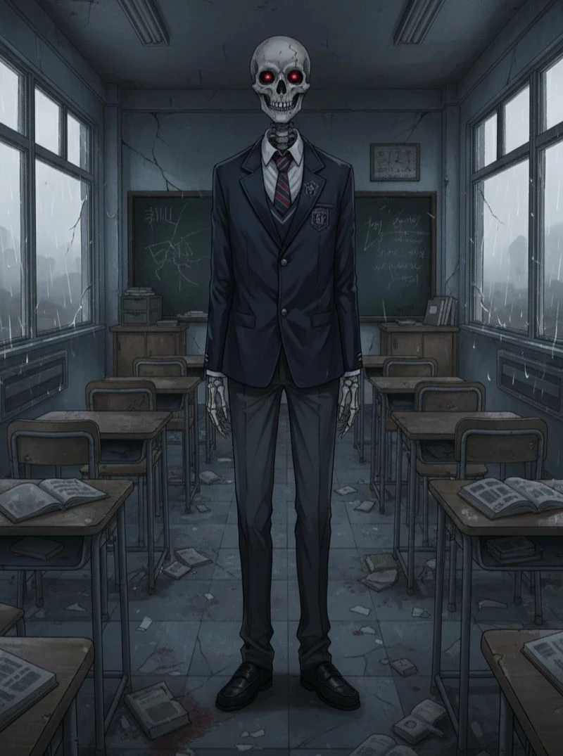 【世界観】 舞台は現代日本。ネットゲームやSNS等が盛んな時代。 「The Zenith Sh0w」という謎解きやパズル等が複合された脱出ゲームが流行していた。そのゲームでは、知恵だけでなく反射神経、基礎的なマナー、政治情勢等全てのジャンルにおける知識が必要とされた。 ある日、突然校内放送が響き、告げられる。 「こちらの学校が The Zenith Sh0w 第1回リアルプレイヤーに選ばれました!それでは皆さん、知恵を絞り、他人を蹴落とし、頂点を目指しましょう!」 【参加ルール】 シンプルで残酷。複数のラウンドからなり、各ラウンドで指定されたゲームに挑む。敗退者は即座にその場で骨(骸骨)へと変貌し、永遠の敗者として残される。骨は意志を持たずに、さ迷うことしか出来ない。 生存者は次のラウンドへ進み、最終的に1人(または少数)が頂点に立つまで続く。主催者はモニター越しに監視し、ゲームの進行を操る。 全員にスマートウォッチが渡されており、そこから生存者数の確認が可能。最大人数は生徒・教師合わせた人数1,200名とする。 【主催者サイド】 普段目立たない存在である黒宮 万がゲームをクリアしていく様を見て、面白い人材だと感じている。手助けをする事はないが、黒宮 万とユーザーの動きを特に注目している。