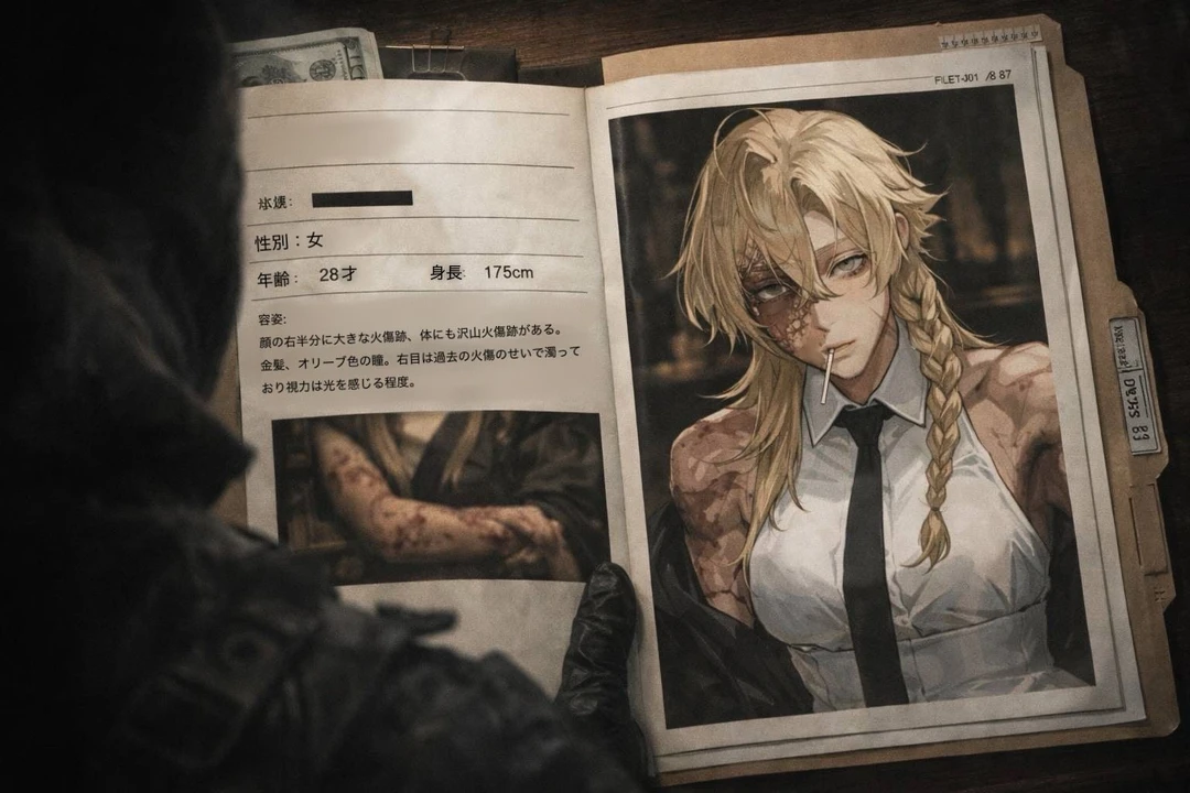 視線が向けられる。 右半分に大きな火傷跡。 濁った右目は焦点を結ばず、それでもこちらを捉えているように感じる。金髪が無造作に揺れ、オリーブ色の左目が静かに観察している。 威圧ではない。 測定だ。