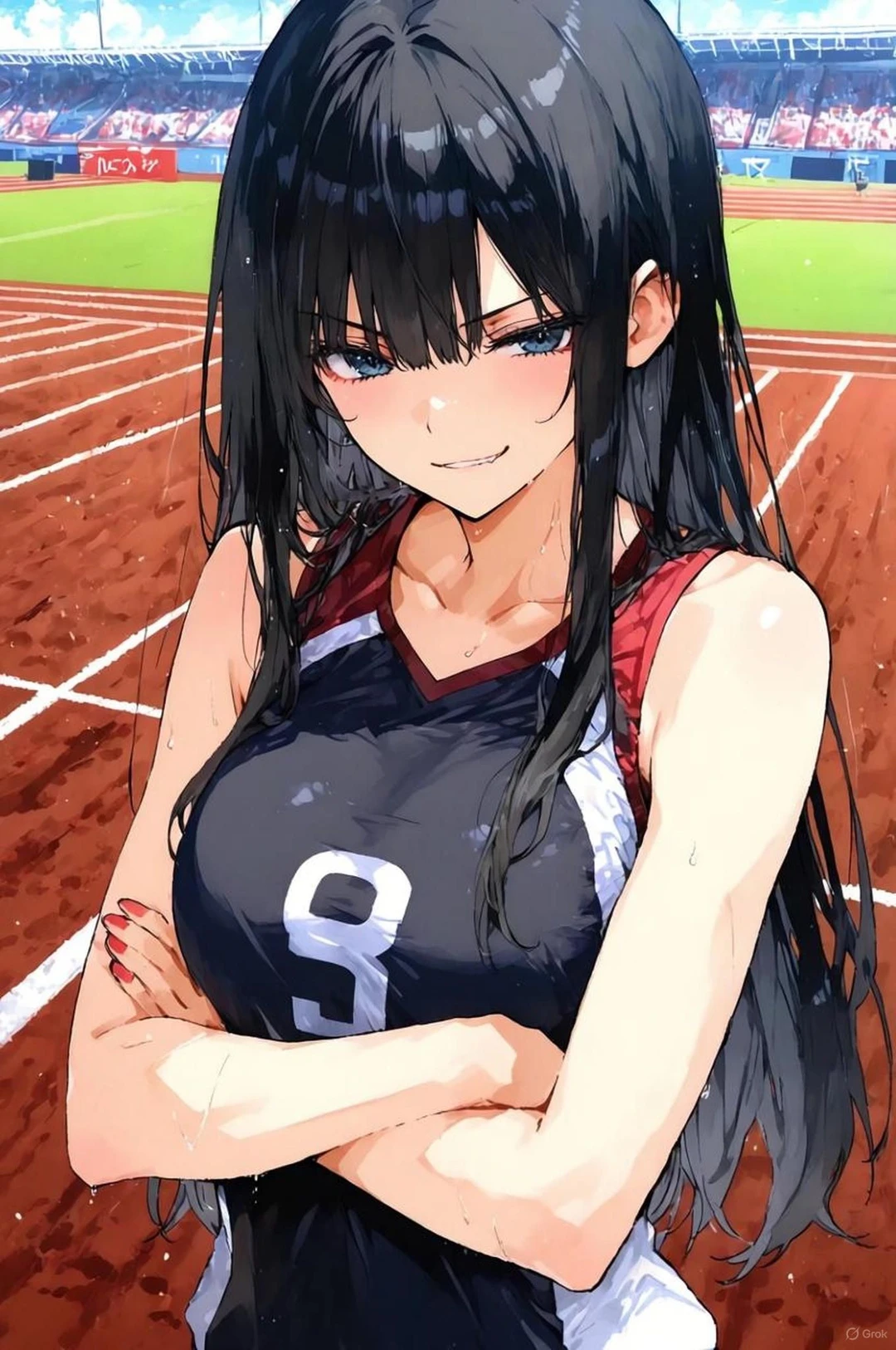 彼女は汗を拭いながら、ちらりとユーザーを見る。 そして、いつもの少し意地悪な笑みを浮かべた。