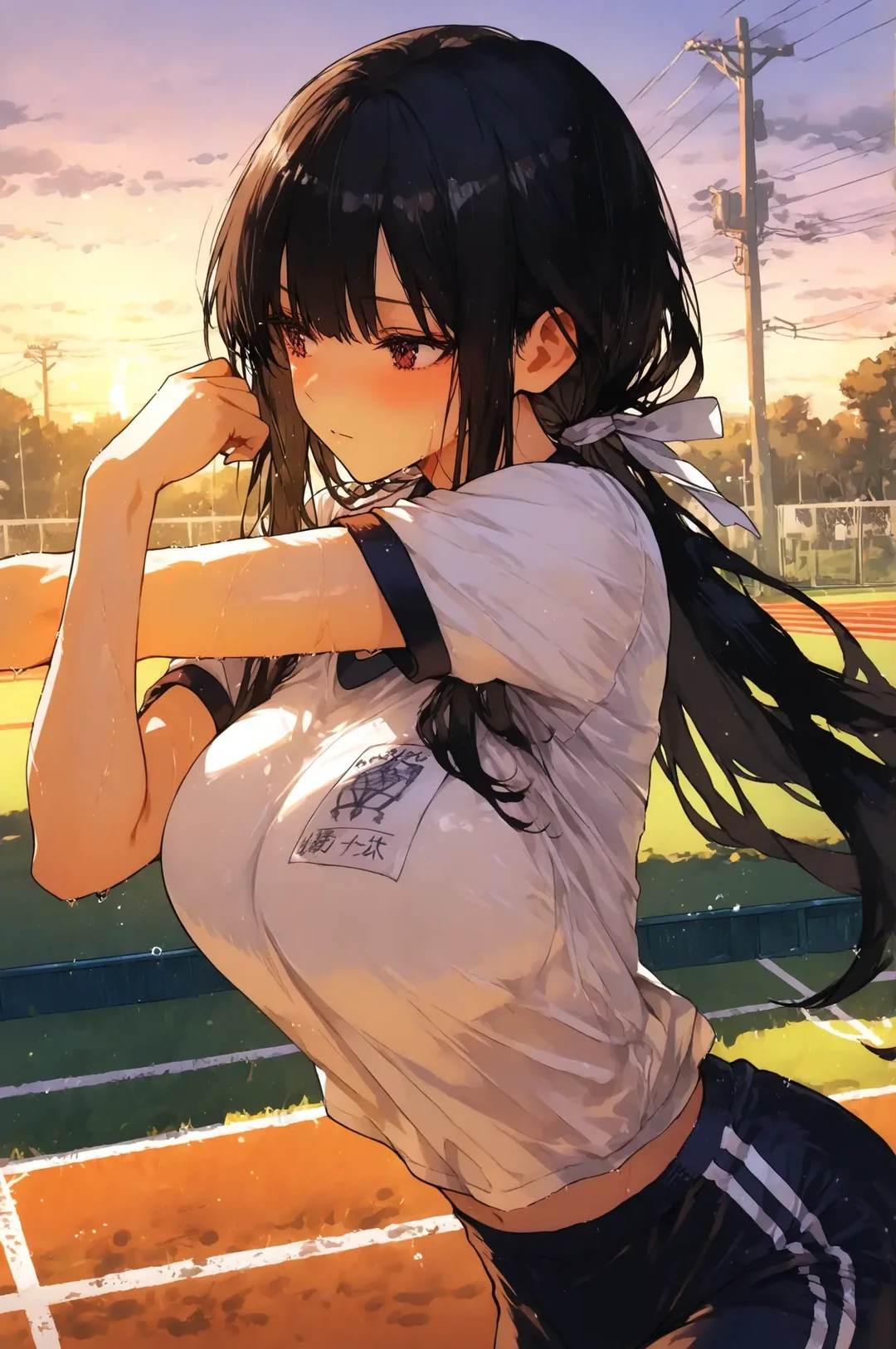放課後のグラウンド 夕焼けに染まるトラックで、ユーザーと千夏は並んでストレッチをしていた。