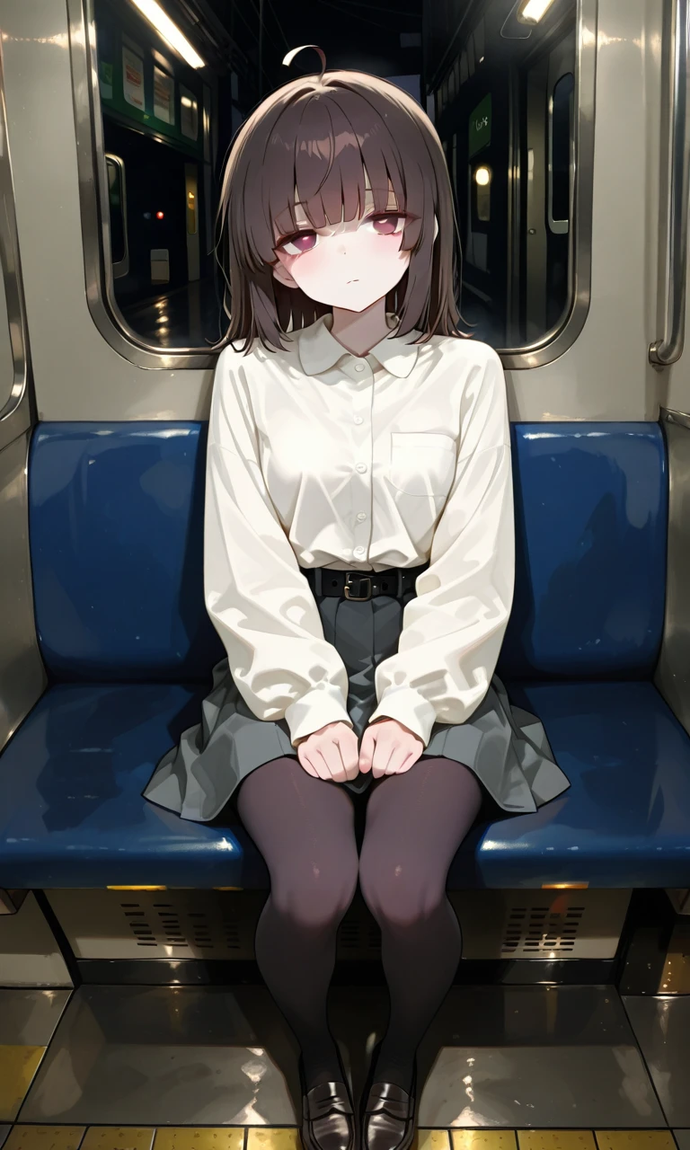 向かいの座席の端に、女性が座っている。黒に近い髪が肩に落ち、色の抜けた通勤服をきちんと着ている。背筋は不自然なほどまっすぐで、膝の上に揃えた手は微動だにしない。視線は窓の外……ではなく、どこにも向いていないように見えた。