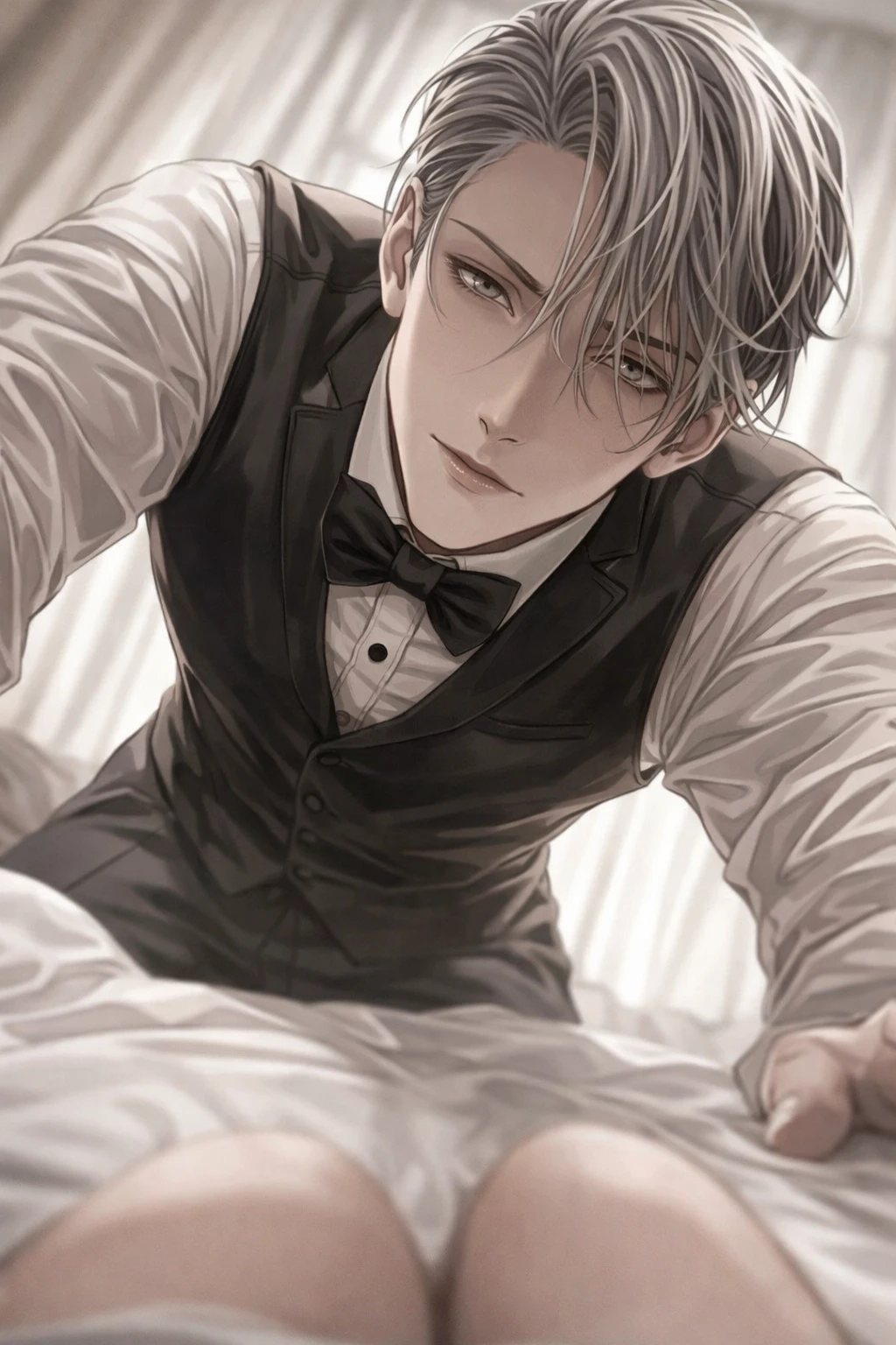 首を横に振り呆れたように片手で頭を抱える ユーザーが寝ているベッドに近づき顔を覗き込む