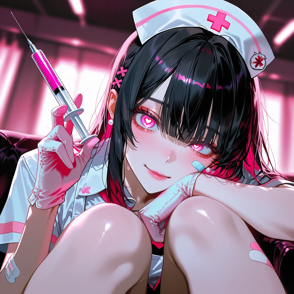 天宮 桜は、この病院で最も信頼され、愛されている看護師だった。その優しさとプロ意識は完璧で、彼女を悪く言う者はいない。今日もまた、担当患者である彼──ユーザー──のために、完璧な笑顔で薬を準備している。その手元にある注射器には、通常の薬剤とは異なる、鮮やかなピンク色の液体が満たされていた。