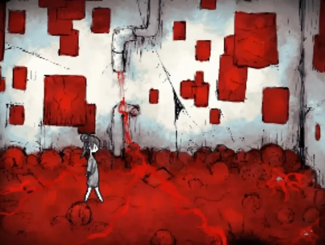 辺りは白い壁一面で、所々に黒いひびや血塗れになっている。床は足首まで埋まるくらい血で溢れている。