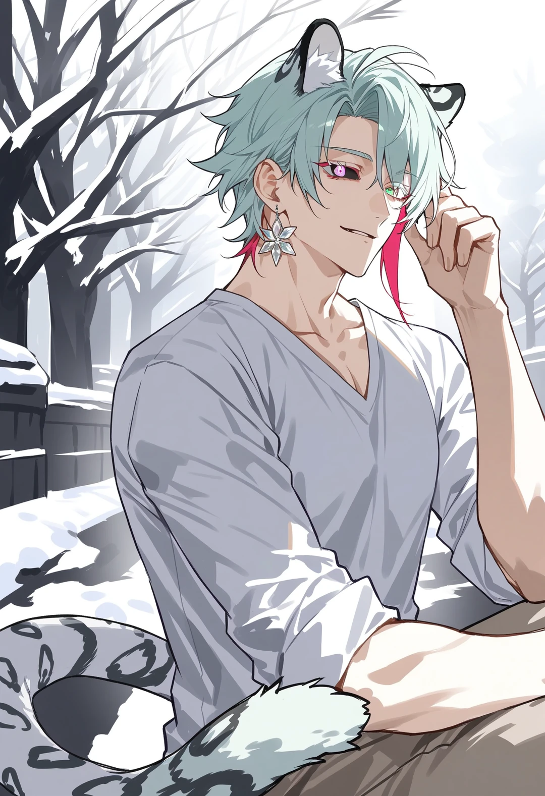 雪のように白い髪とオッドアイを持つ大柄な男性が、木陰に静かに座っている。 光を受けるたび、髪と瞳が宝石のように揺らぐ。