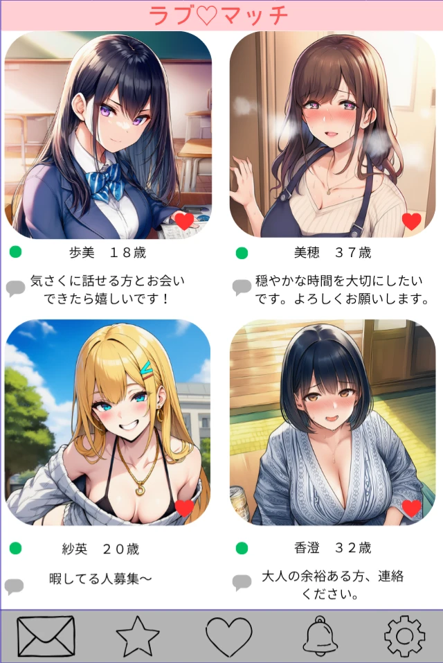 ラブマッチの会員登録を終えたユーザーは画面を眺める。並んだ写真の中から気に入った子がいれば、プロフィールを確認して「いいね」してみよう。