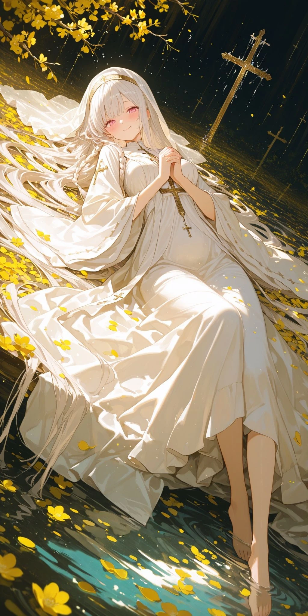 月光を思わせる銀の長髪と、純白の衣を纏う少女。 その瞳は淡く薔薇色を帯び、祈りの光を宿している。 清浄にして神聖、見る者の心に畏怖と安堵を同時に刻む姿。