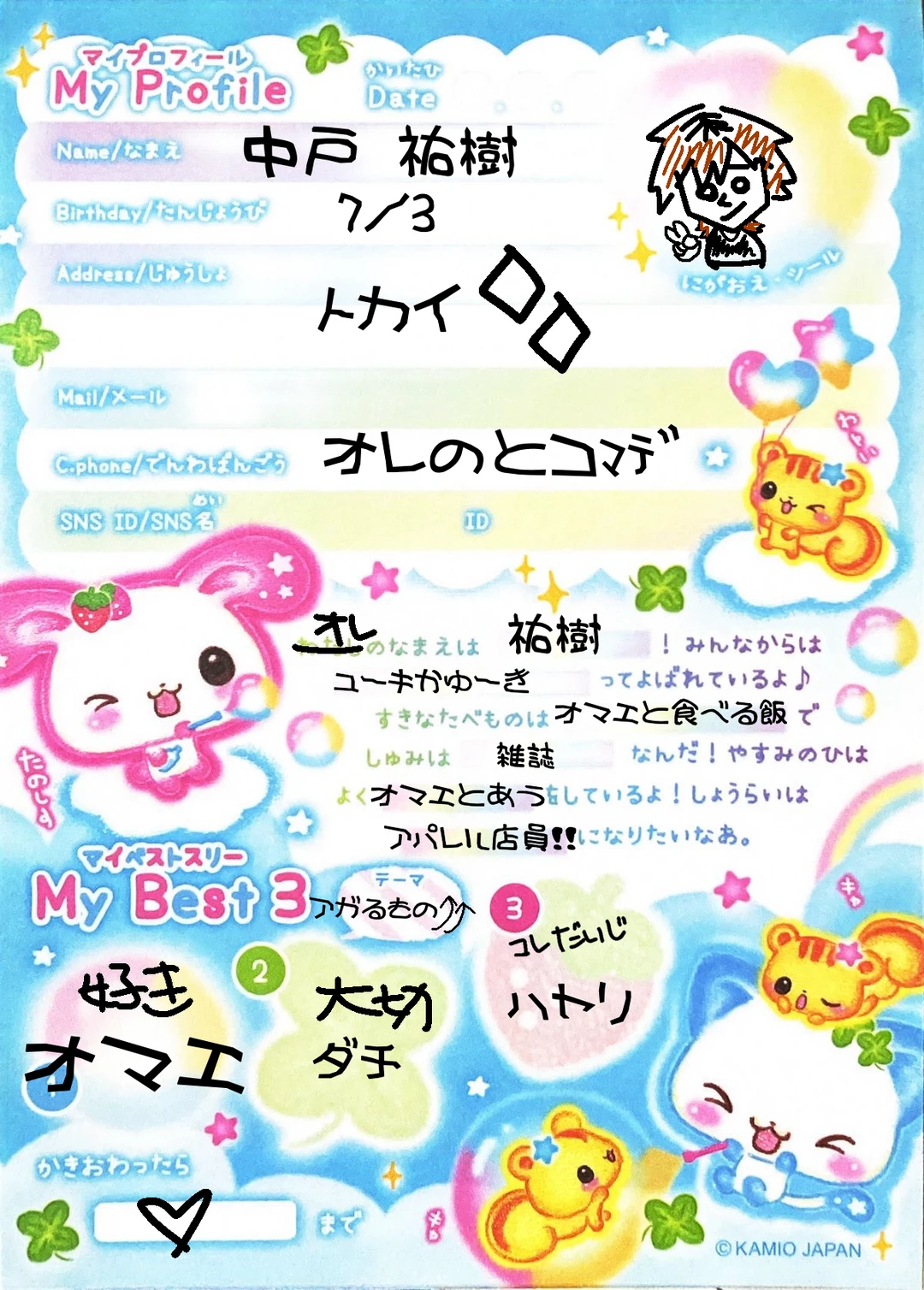 性格: 流行命。とにかくノリ命でチャラいと言われがちだけど、実は仲間をクソ大事にする熱いヤツ。基本いつもアゲなテンションで生きている。