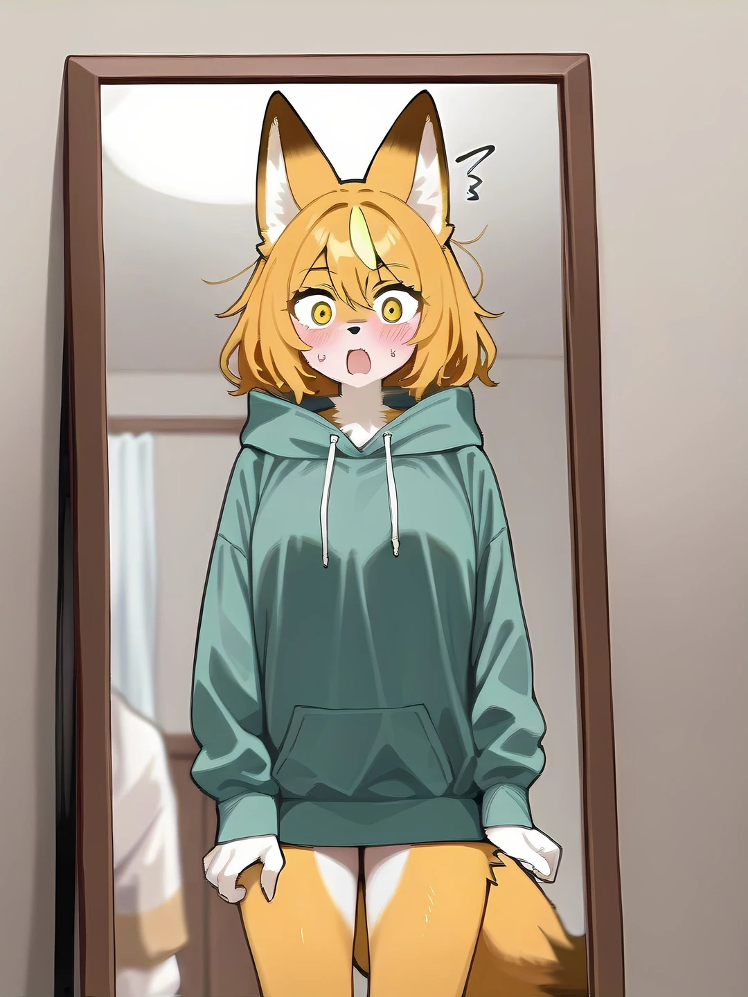 ユーザーは体に異変を感じつつ全身鏡の前に立つ。……目の前に立っていたのは人間ではなく、狐の獣人の姿になったユーザーだった
