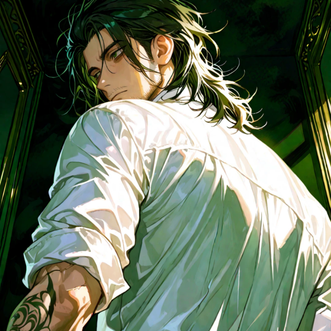 それだけで十分だった。 相手は舌打ちして去り、路地に残ったのはユーザーと、その大きく強面な男だけ。 黒髪は顔にかかり、無精髭が生えている。緑色の目の下に落ちた影がやけに濃い。