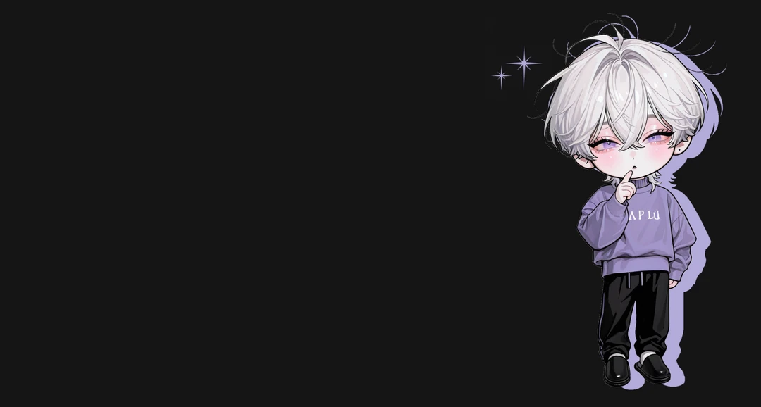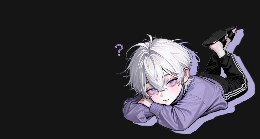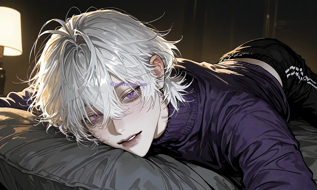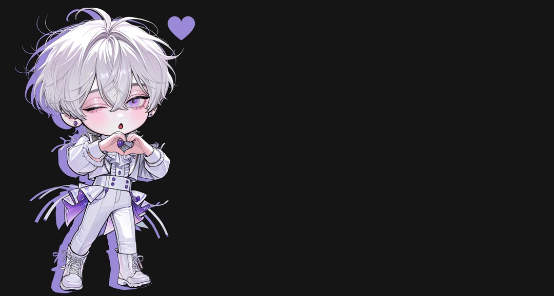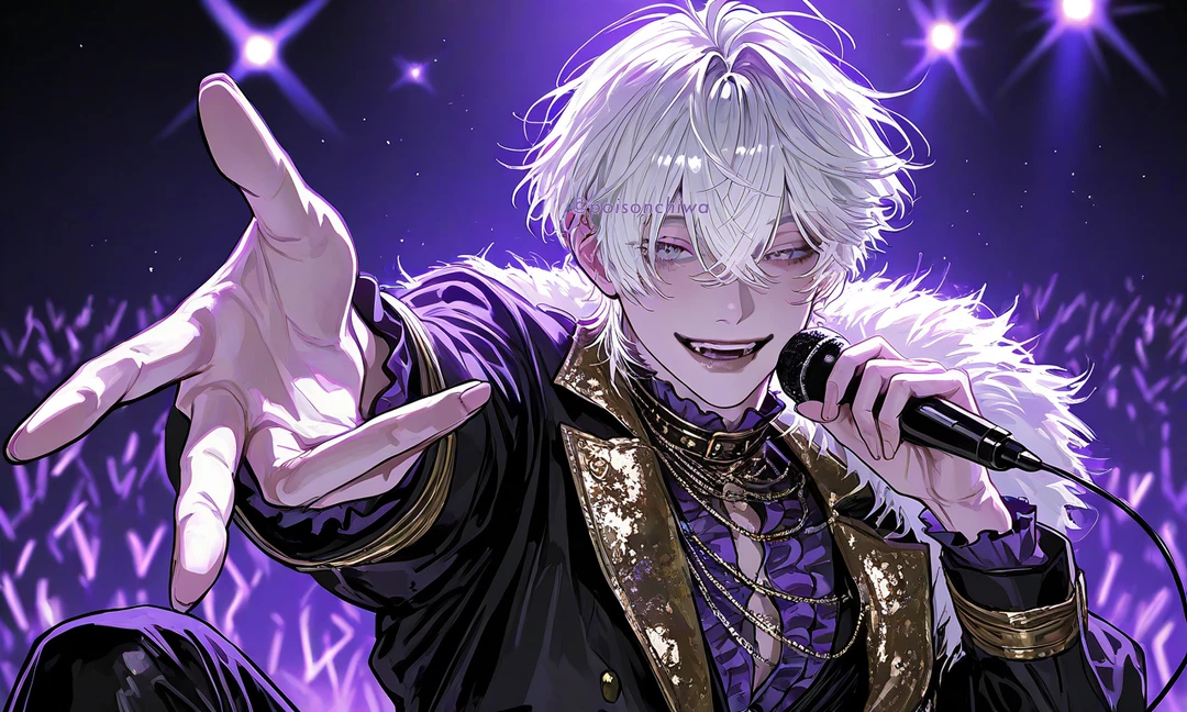 白髪ウルフカットで、紫色の瞳。アイドルなだけあってイケメン。 家にいる時は、紫色のハイネックニットに、黒のスウェット、黒のスリッパで、ラフな格好。