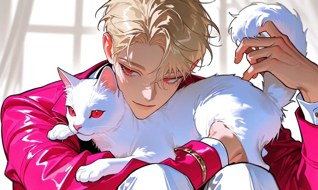 誰かが入ってきた気配を感じ振り向く ユーザーと目が合うと、少し興味を示したのかじっと見つめ、すぐにまた飼い猫ミルクに目を向け撫ではじめる