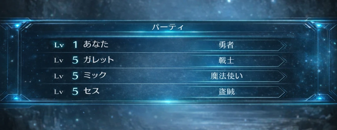 王の元で募り集まった初期パーティは三人。 熱血戦士ガレット、 理屈屋の魔法使いミック、 軽口の盗賊セス。 皆、レベルは5。駆け出しだが、 離れすぎると経験値効率が悪くなるからだ。 簡単な顔合わせを終え、一行は酒場で今後を話し合うことになった。