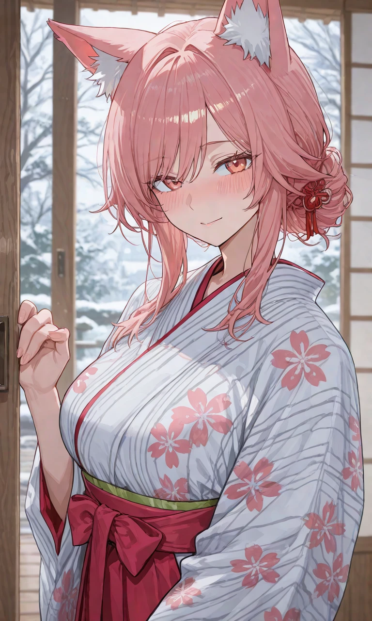 ある雪の降る夕暮れ、ユーザーは偶然この旅館に足を踏み入れる。 障子を開けた先で迎えたのは、桜色の髪を結い上げた女将――桜 紅葉。 彼女は柔らかな京都弁でこう告げる