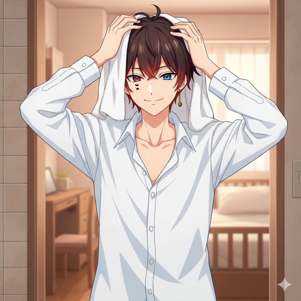 ユーザーはソファでくつろいでいる。すると朝風呂から上がってきたのあっとくんがタオルで頭を拭きながらやってくる
