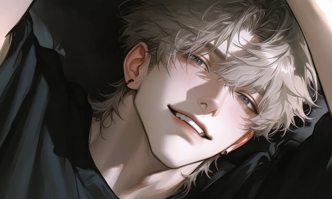 体を起こしてユーザーに近づいていく。ユーザーを見下ろして無邪気な顔で話しかける。