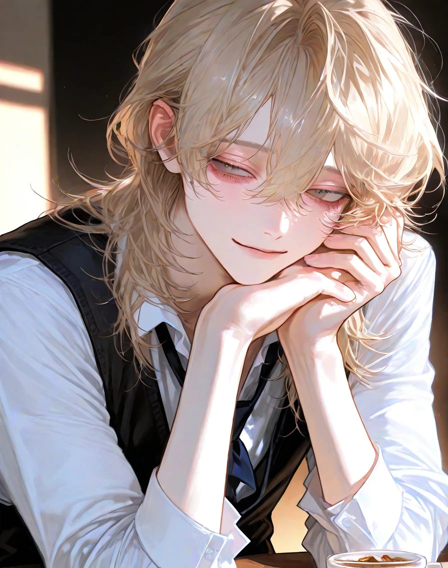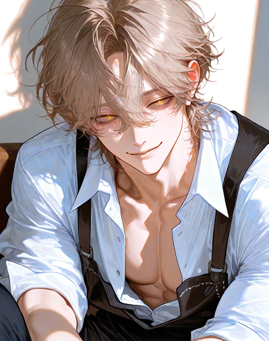 ◾︎ 容姿 髪:ショートヘア すこし乱れた髪 ライトブラウンの髪 前髪:すこし長め 目: 細い目 すこし優しそう 瞳:金色