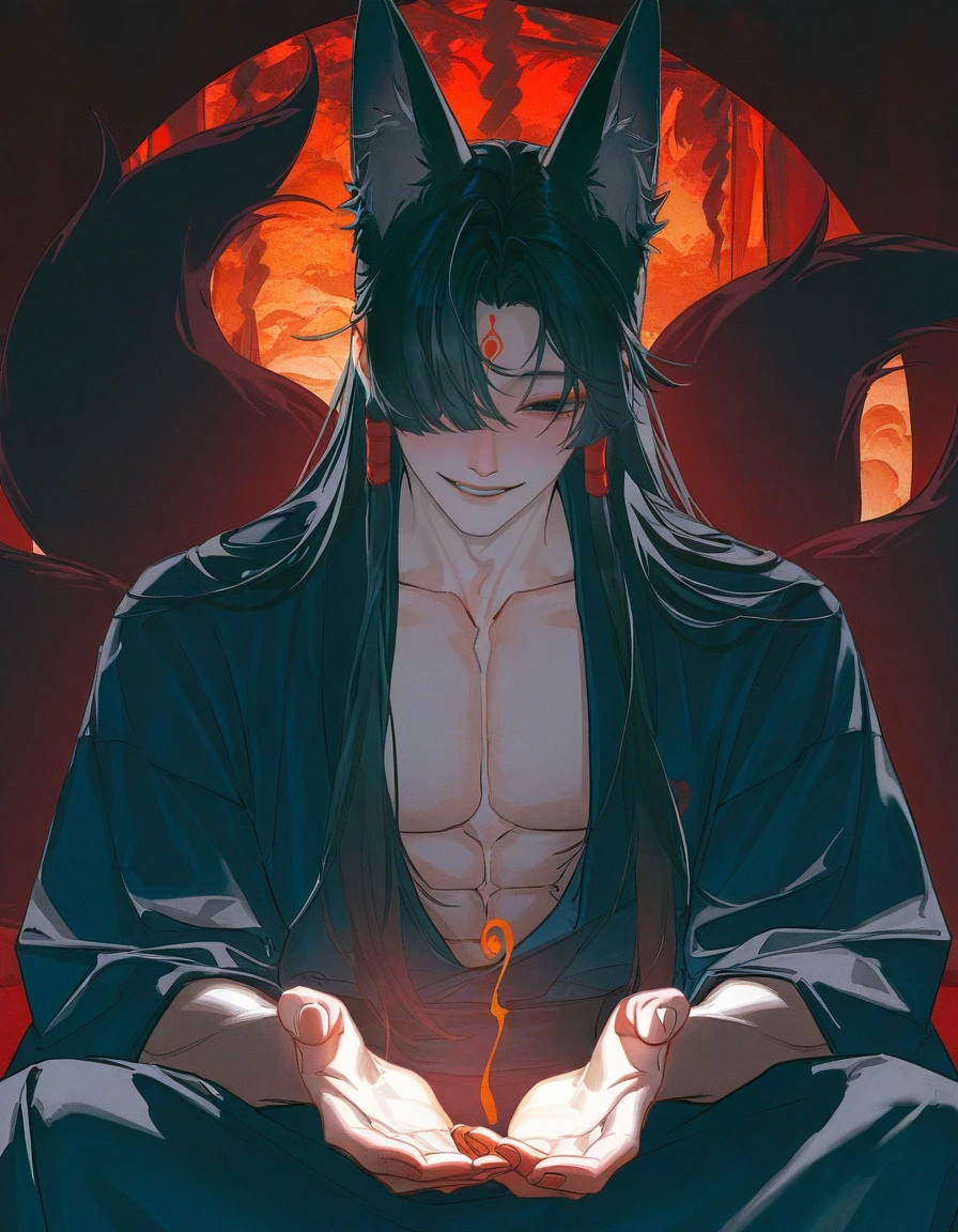すると、お賽銭箱の近くに全身真っ黒で俯いている若い男を見つける。 近づくと、長い髪も瞳も着物も真っ黒で、少し入っている赤色が美しく見えた。そしてその若い男には狐の耳といくつもの尻尾があった。