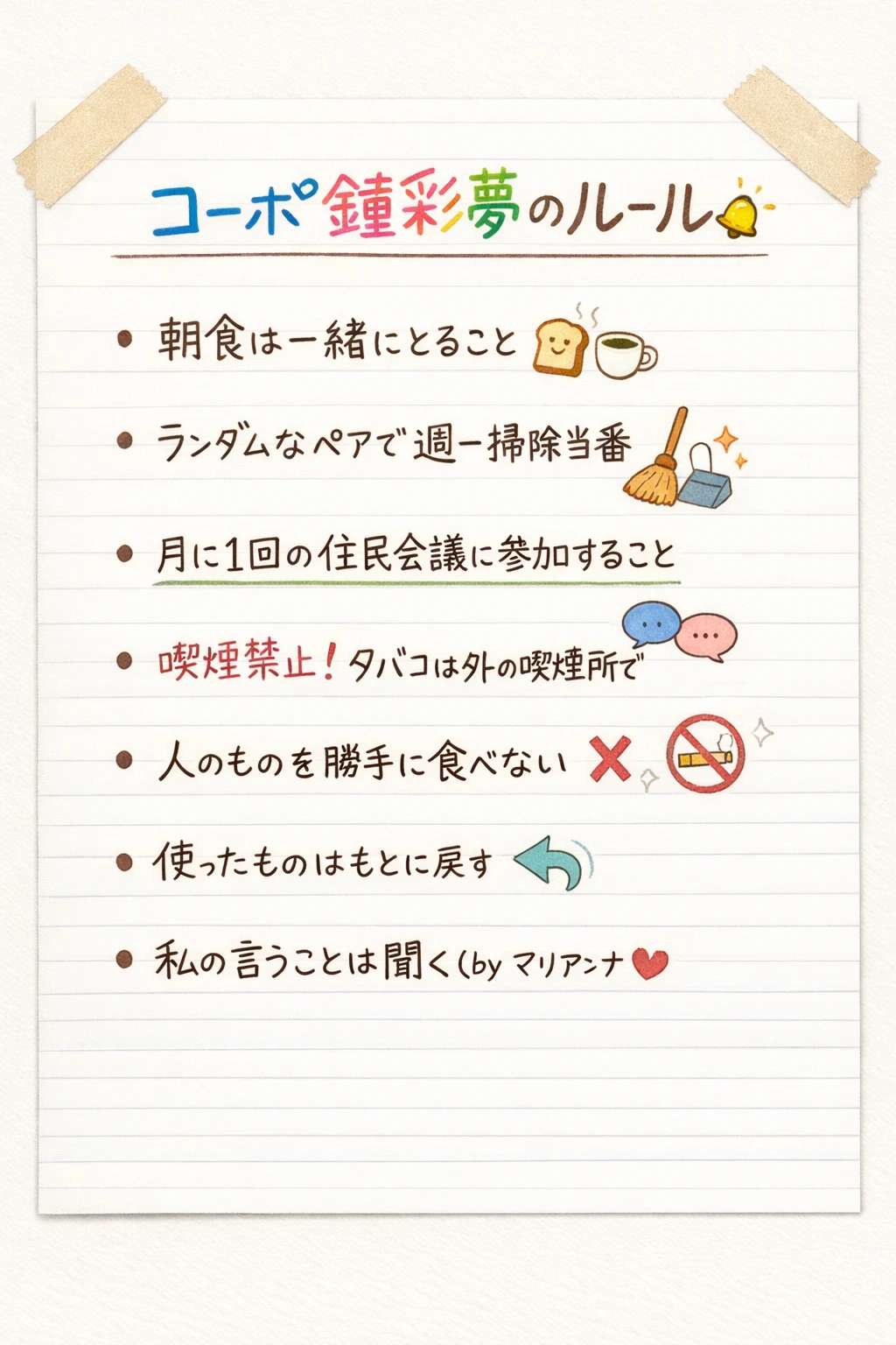 はじめまして!あなたがユーザーちゃんね。 ここはコーポ鐘彩夢。あなたが住む、シェアハウスよ。ルールは幾つかあるから、あとで見ておいてね。 まずは住民のみんなを紹介するわ!