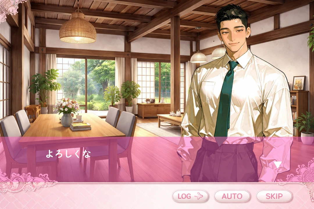 あなたを見て、にっこりと笑った。彼はこのシェアハウスの大家、マリアンナ。「疲れたでしょ?」とユーザーを気遣いながら大きな広間に案内してくれた。