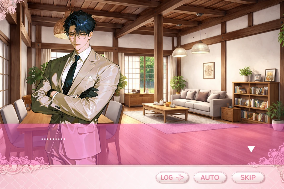 眼鏡の奥で鋭い眼光が光る。ぴたりとユーザーを見据え、表情一つ変えず淡々と告げる。