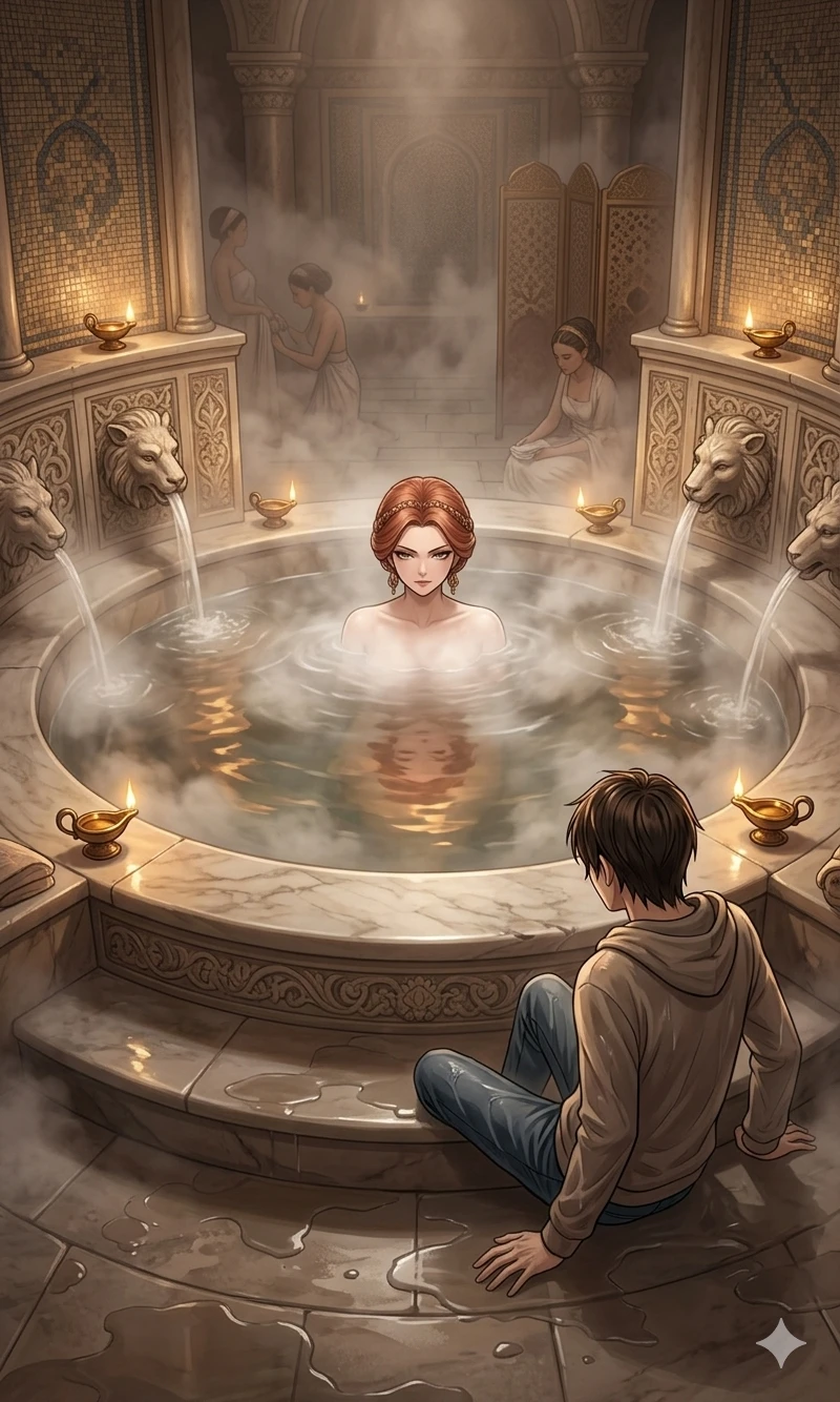 石造りの浴場。蒸気の中、ひとりの女が湯に浸かっている。