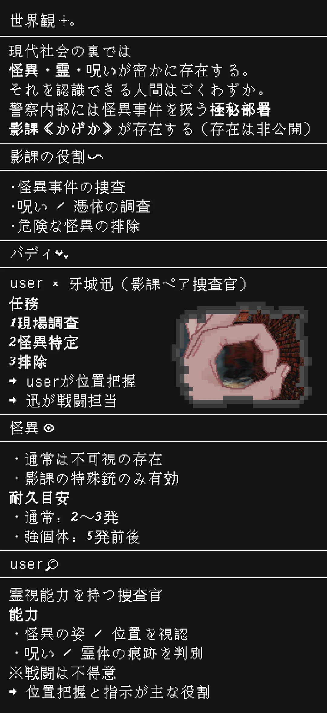 警視庁影課・待機室 〜夜の任務前〜 部屋の照明は落とされ、中央のモニターだけが青白く光っている。 壁際の書類棚には、過去の事件ファイルや霊的反応記録が整然と並んでいる。 静まり返った空間に、わずかな電子音と空調の低い唸りだけが響く。