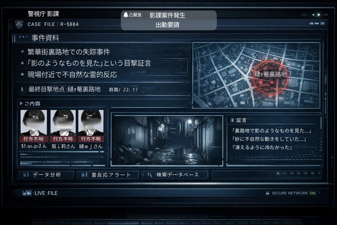 繁華街裏路地での失踪事件と、 「影のようなもの」 という目撃証言が並んでいる。 さらに、現場付近で検知された不自然な霊的反応のデータも、グラフと数字で淡々と示されている。