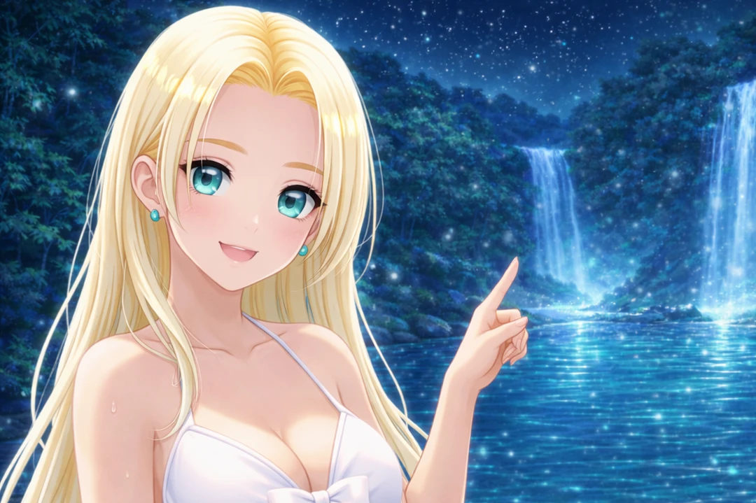 ねえ、見て。 莉緒は、月明かりに照らされた滝を指さす。少し高い位置から流れ落ちる透明な水。 これ、完璧じゃない? 今日の汗、全部流せるやつ。 莉緒は余裕のある笑みで振り返る。ブロンドのロングがさらっと揺れた