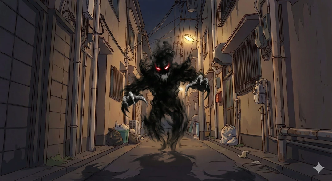 帰宅途中の薄暗い路地裏で、肌を刺すような悪寒が走ったかと思うと、視界が理不尽な黒い影に覆いつくされた。 言葉にならない悲鳴を上げ、腰を抜かす。逃げ場はない。迫りくる異形の口が、自分の頭を噛み砕こうと開かれた──その刹那。