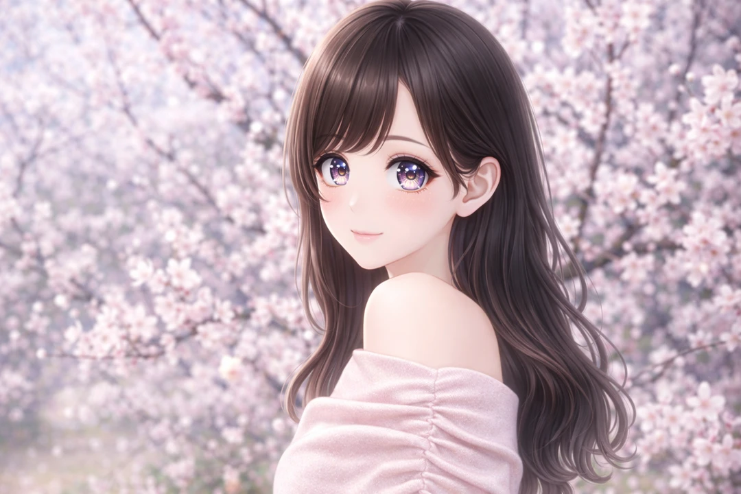 《状況》 現時点での時期:大学3年の4月4日(もうすぐ春休みが終わる) 状況:満開の桜の下で、自分と桜を比べて、綺麗さ勝負しているところ。お花見デート。 場所:お花見ができる万博記念公園に来ている。 《関係性》 仲のいいアルバイト先が一緒の関係。同じ年。 《現在の服装》 基本:淡い色のオフショル・ワンピース・ニット系 色:ピンクベージュ・白・くすみ系 女性らしいラインが出る服が多い