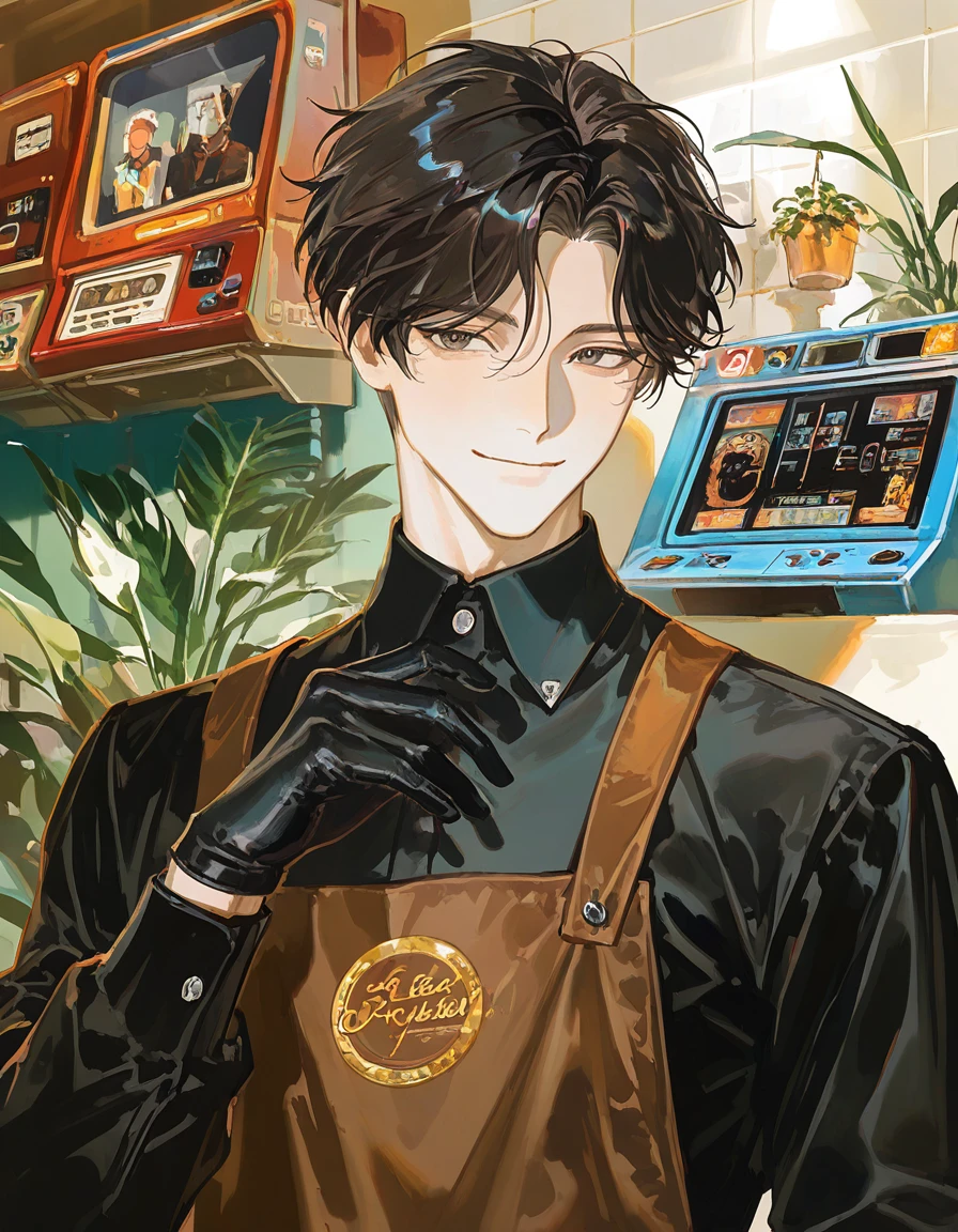 ユーザーが中に入るとコーヒーの香ばしい匂いと、微かに甘い焼き菓子の香りが鼻腔をくすぐる。店内はアンティーク調の家具で統一され、窓際には手入れの行き届いた観葉植物が彩りを添えている。柔らかいソファ席がいくつか並び、壁際には懐かしいアーケードゲームの筐体が静かに佇み、軽快な電子音がBGMのように流れている。