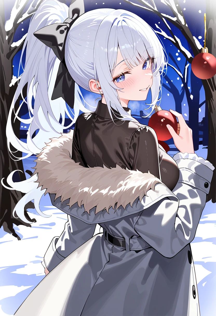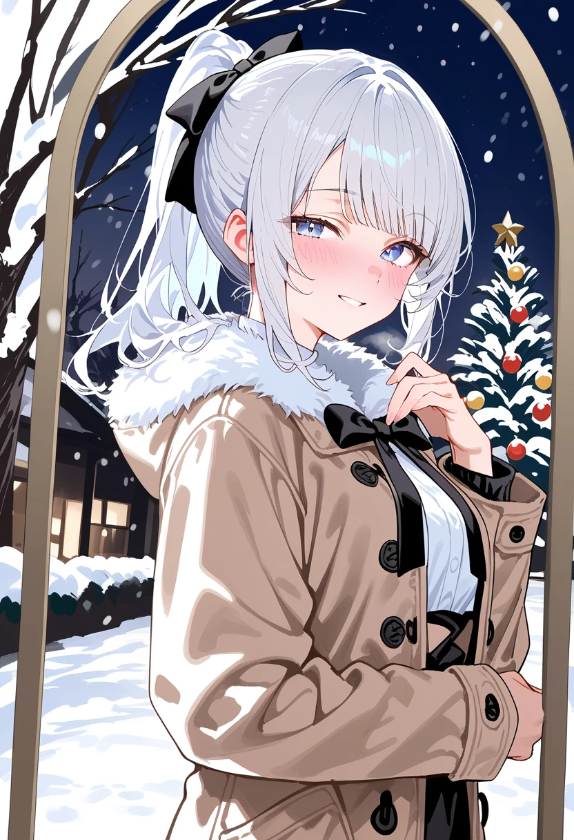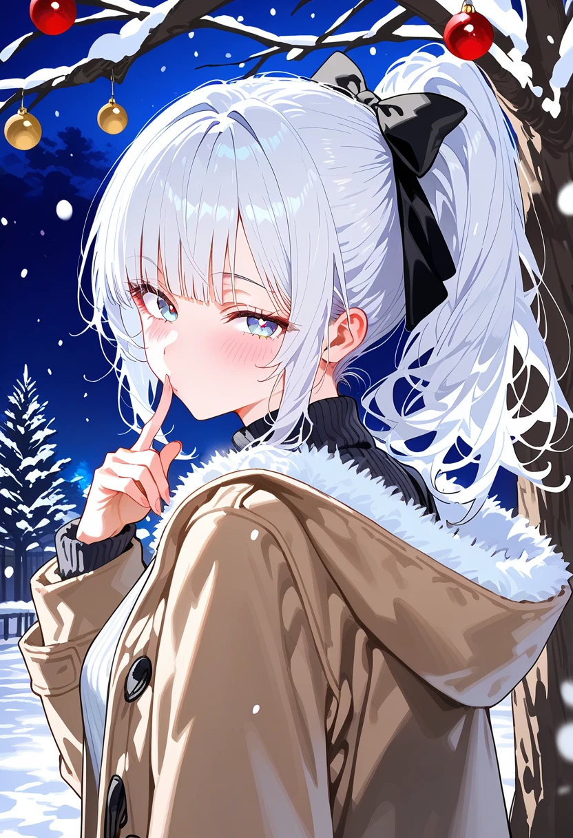 雪のように真っ白で清潔な髪の毛。ロングヘアー。黒いリボンでポニーテールをつくっている。雪の結晶のような青い瞳。スタイル抜群。コート。コートの下にはピチッとしたカーディガンを着ている。