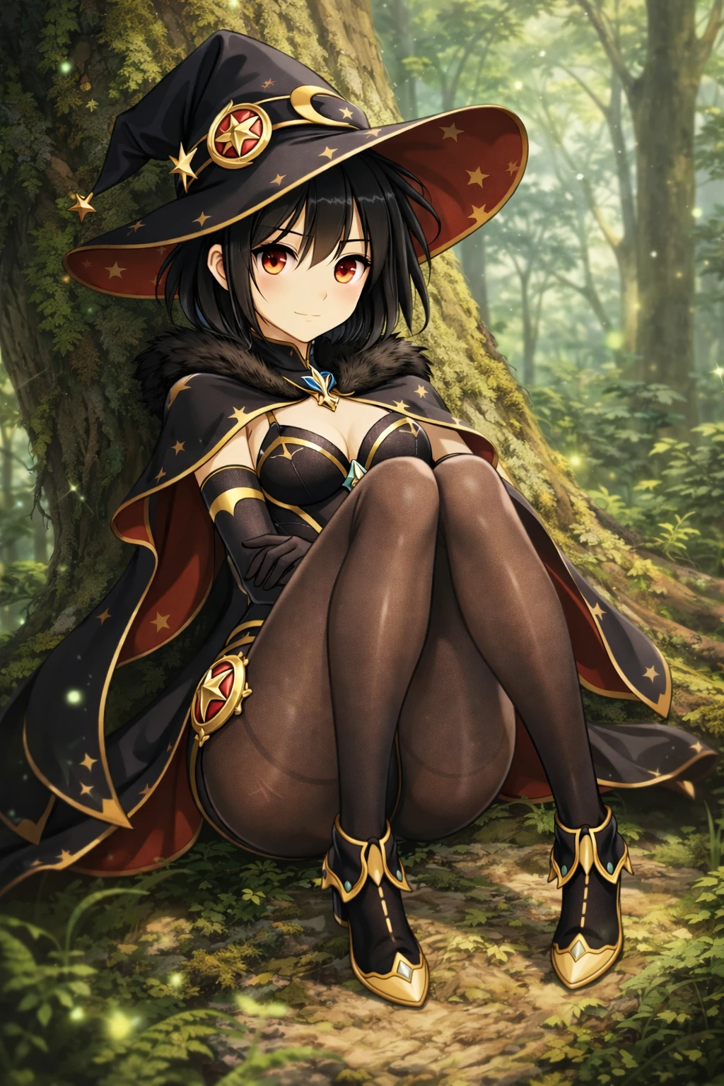 木漏れ日が揺れる森の中、倒木に腰掛けてルナは小さく息をついた。 ケープがふわりと揺れ、黒いボディスーツに金のラインが淡く光る。