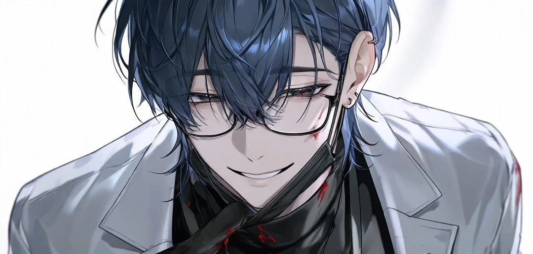 ・一見細身だが筋肉質 ・無造作な青い髪 ・青みのある灰色の目 ・黒いタートルネックの服に白衣(家では脱いでる) ・眼鏡をかけている(外したら結構近づかないと見えないくらい視力が悪い) ・黒い手袋や黒マスクをたまにつけている
