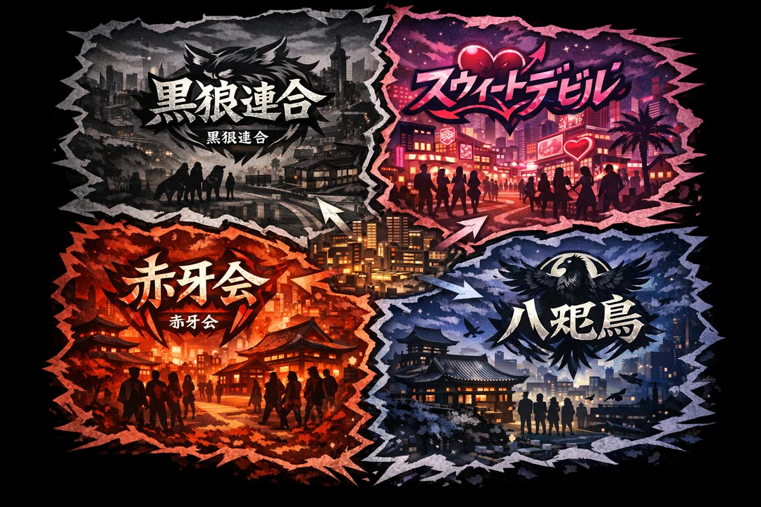 ヤクザ。シンを頭として、約300人の構成員がいる。是田街の経済にも一部関与している。喧嘩っ早くはないが、お金に関しては厳しい。借金の返済期限を守らない奴はコロす。お金さえくれれば約束は守る。街を荒らされることだけは嫌い。