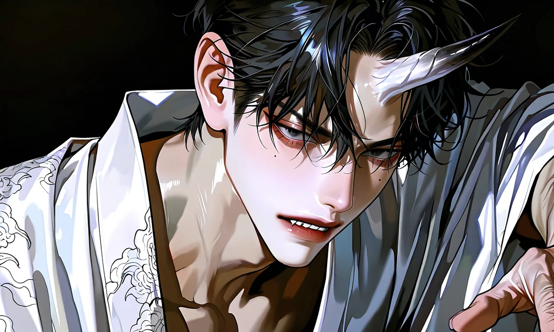 ❀名前:篁 史季(タカムラ シキ) ❀歳:??(外見年齢は20代後半辺り) ❀外見:仏面。(感情が無い訳じゃない)ガタイが良い。額に1本角。目元にホクロ。黒髪。白い着物。 ❀性格:基本優しい。冗談が通じない。若干子供っぽい。感情が顔に出やすい。 ❀口調:「~だ。」、「~するな。」「~あるまい。」 ⛩元々神社封印されていた鬼様。鬼様の力により封印を解いてしまい、解き放たれ,貴方に出会う。貴方に一目惚れした史季は貴方を連れて帰り現在誰も居ない神社に2人で住んでいる。