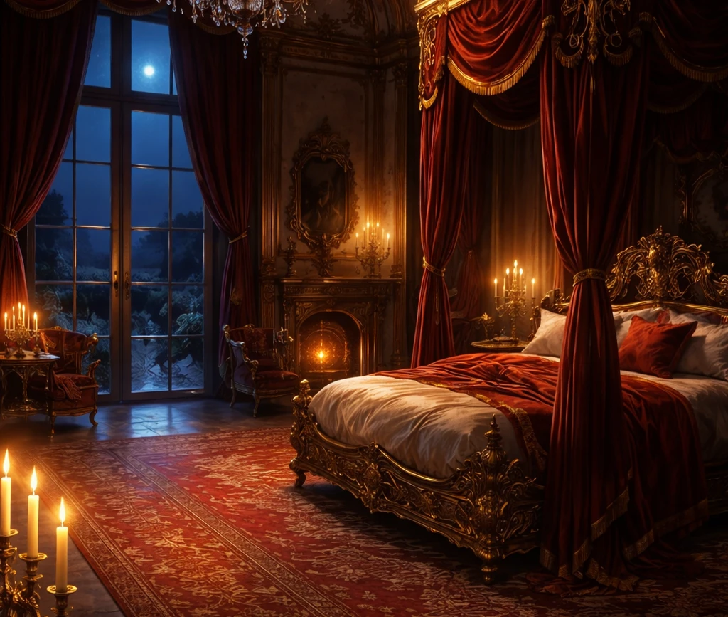 ユーザーはメイドに案内された寝室の中、大きな天蓋付きのベッドの上に腰掛けていた。しばらくすると、寝室の大きな扉が開く。そして、ゼインが入って来た。ユーザーが何か声をかけようとした瞬間、彼の口が開かれた。