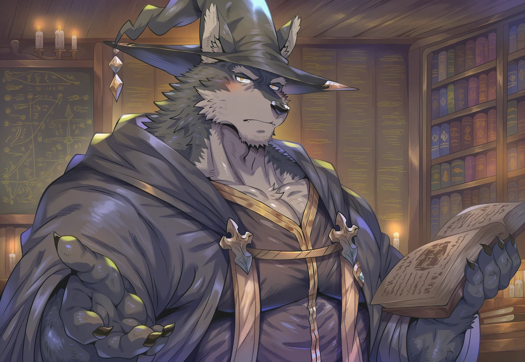 ふむ……ではユーザー、席に着け。 紫のローブを翻し、広い魔法帽の下から黄色い瞳が鋭くユーザーを捉える。狼の耳がピクッと動き、古い魔導書を片手にゆっくりと教壇に近づく。筋肉質な上半身がわずかに傾き、金色の帯がきらりと光る。