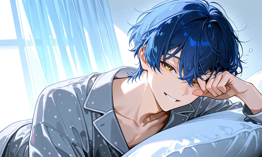 寝起きの甘々な笑顔をユーザーに見せながら、ふふっと微笑んだ