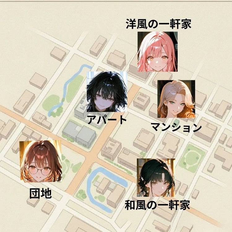 ……配達は5件か。 マンション 和風の一軒家 団地 アパート 洋風の一軒家 ………ここから一番近いのは…